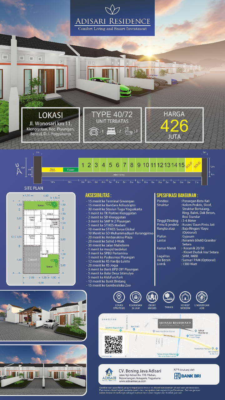 Perumahan Adisari Residence sendiri berada di kelurahan Srimulyo, Piyungan, Bantul. Perumahan yang berada lokasi strategis ini patut Anda perhitungkan sebagai hunian nyaman sekaligus tabungan atau investasi di tengah pandemi yang tidak pasti kapan berakhirnya.